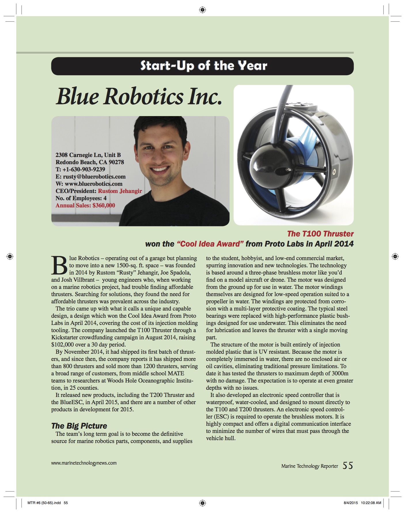 Just a few days ago we were recognized by Marine Technology Reporter Magazine as the “Start-Up of the Year” in their MTR100 review! We are very proud and honored to be included. Check out the write-up here.