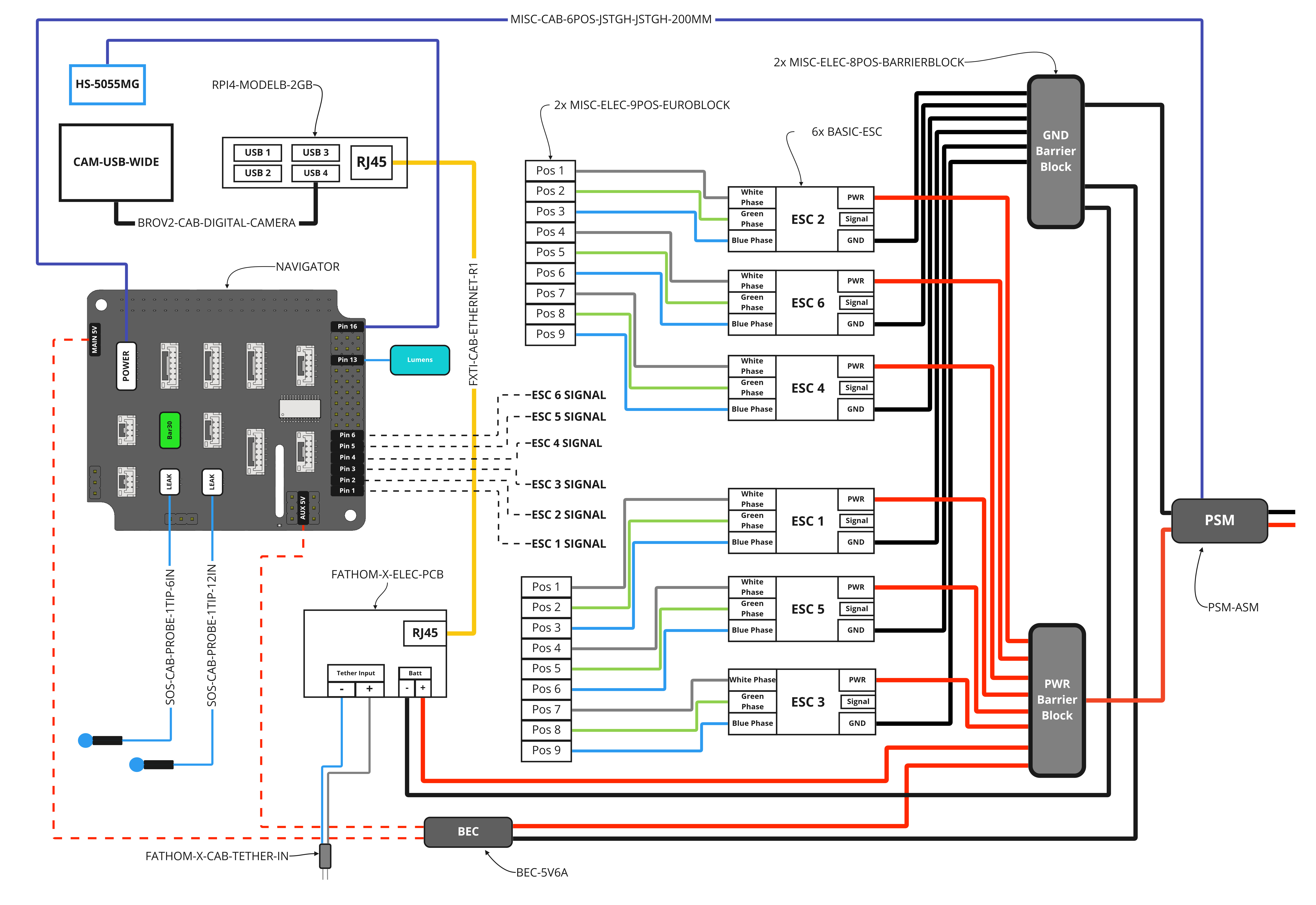 These diagrams outline all of the electrical connections between components in the ROV. There is a different diagram for each version of the ROV that Blue Robotics has produced.