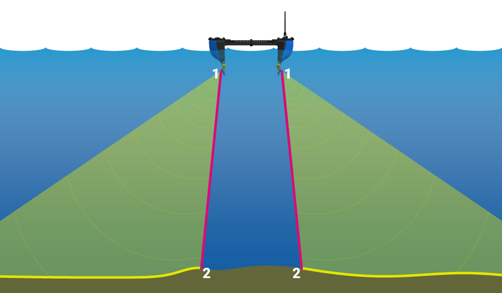 Notice the dark area in the middle of the sonar image above. It may look like missing information from the sonar image, but this is not the case. As the sound pulse is emitted from the transducer (#1 in the image below) and travels through the water, no echoes have been reflected back to the system yet. This lack of echoes as the sound travels through the water results in the dark area in the middle of the sonar output image. This area is known as the water column, or “nadir” region.