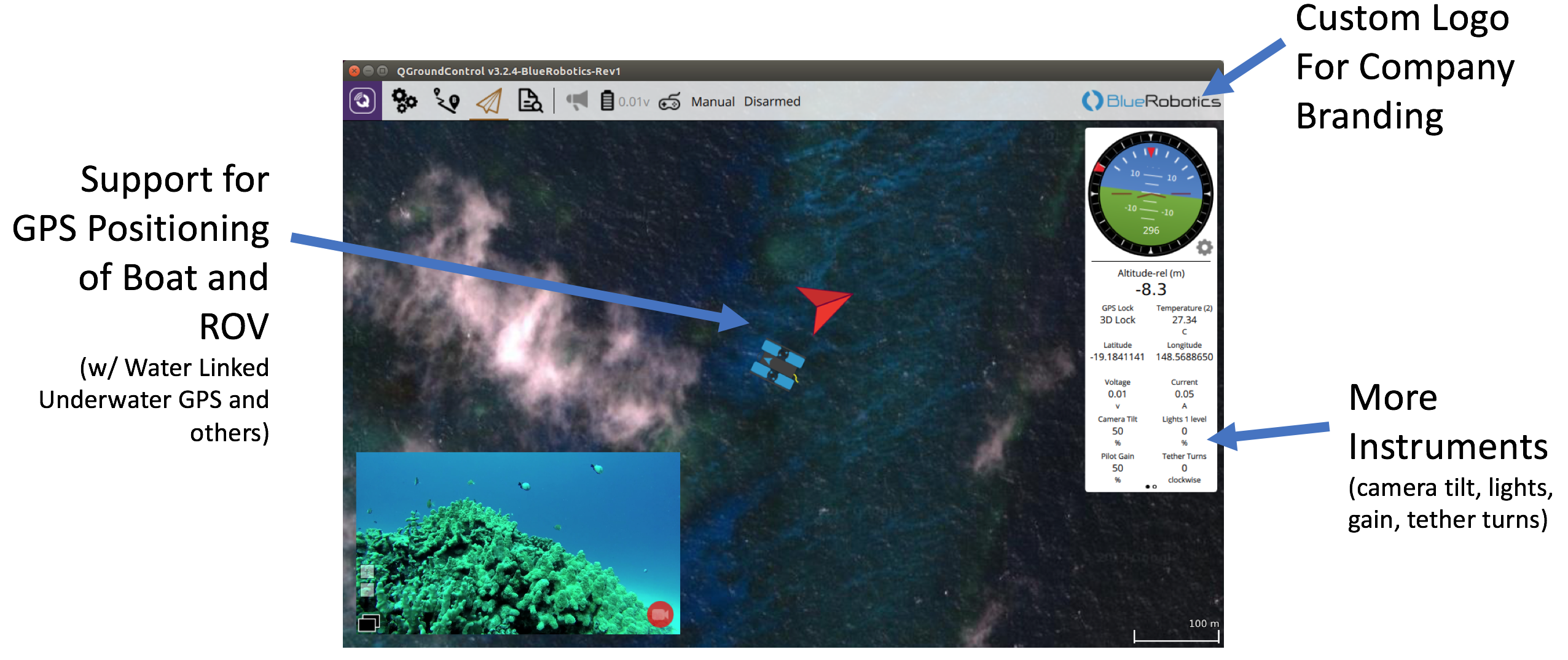 - Ability to display camera tilt angle, lights level, tether turns and more in QGC