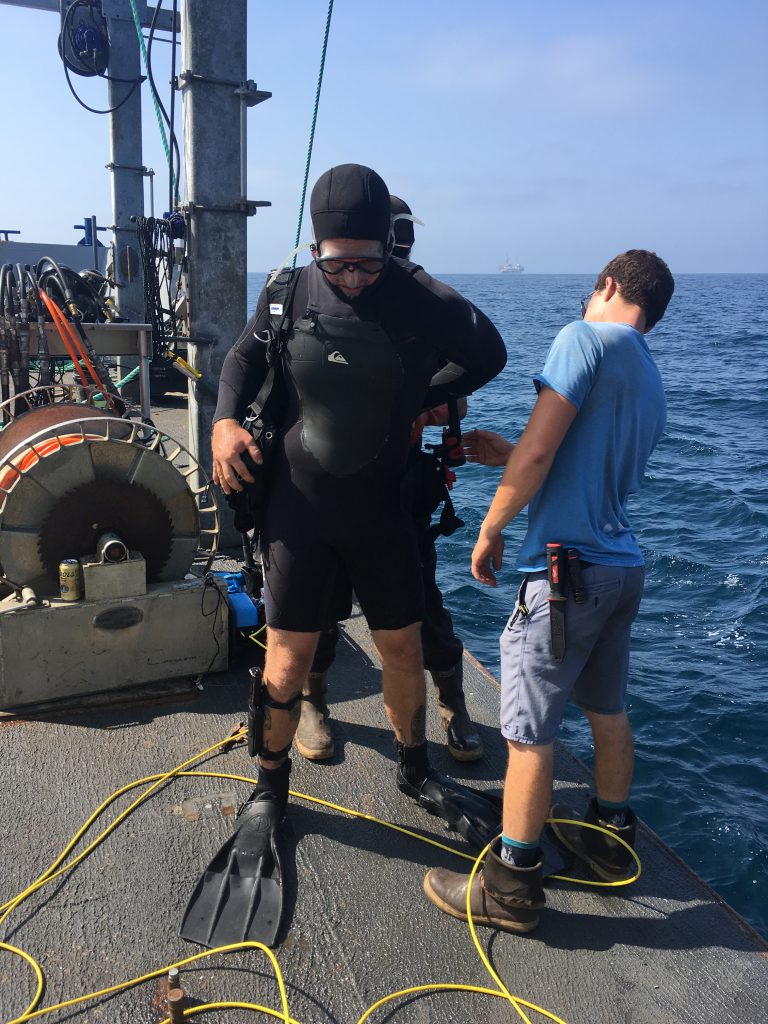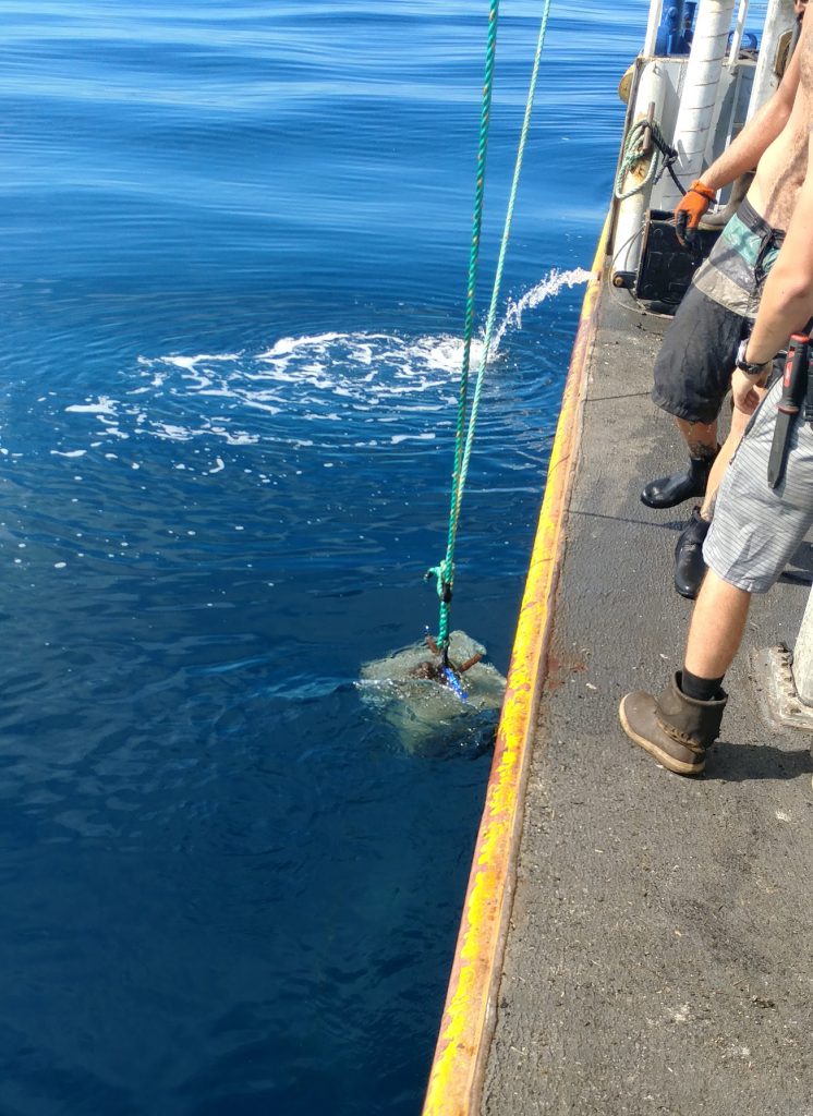 We were skeptical of whether a retrieval via cable would be successful, as the end of the wire was only tangled under the weight. We slowly lifted the weight until it was about 80 ft below the surface, at which point a diver manually secured the connection. We held our breaths as the diver surfaced and the final lift started, but within moments we realized the reattachment attempt failed and the weight was lost again.