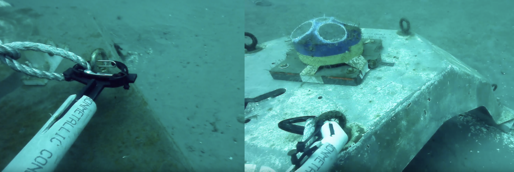 Using the coordinates of the weight’s last known location, we set off on our first dive. After a few exploratory dives, we made our first attempt at capturing the cable we would use to pull it up. As the ROV approached the target, the mouth of the carabiner prematurely closed. Thinking quickly, the pilot was able to capture the ½” steel cable attached to the weight by forcing the cable through the carabiner gate. The ROV then cleared the area and we began to pull the weight to the surface.