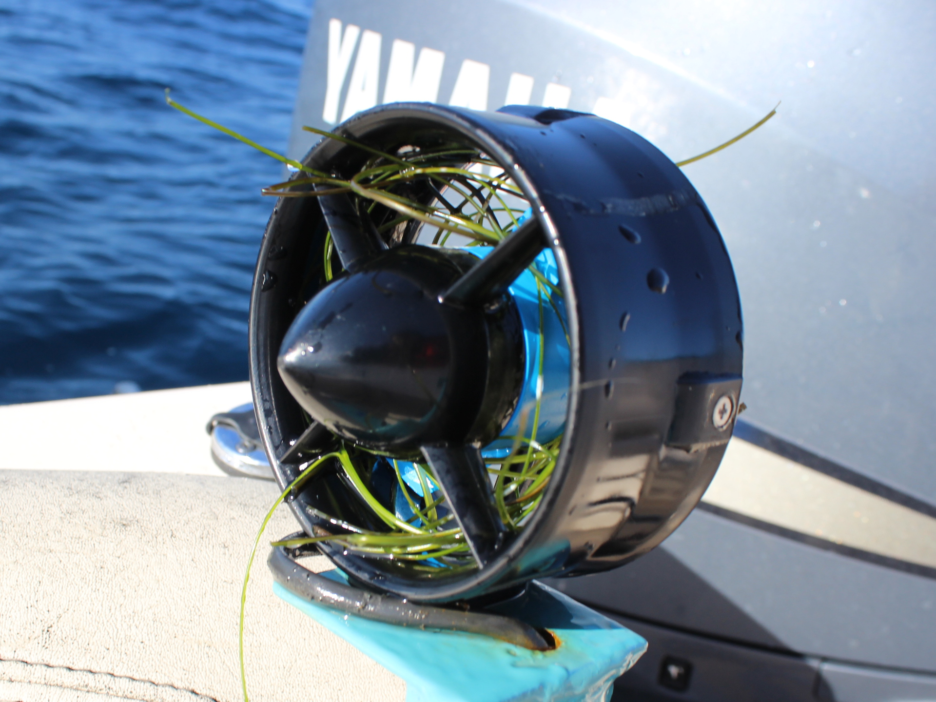 We think this will be fairly easy to fix with some plastic mesh stretched over the front of the thruster and secured with the four outer screws. Since this would be useful to all of you, we will post instructions if it works. Anybody have any other clever ideas for seaweed avoidance?