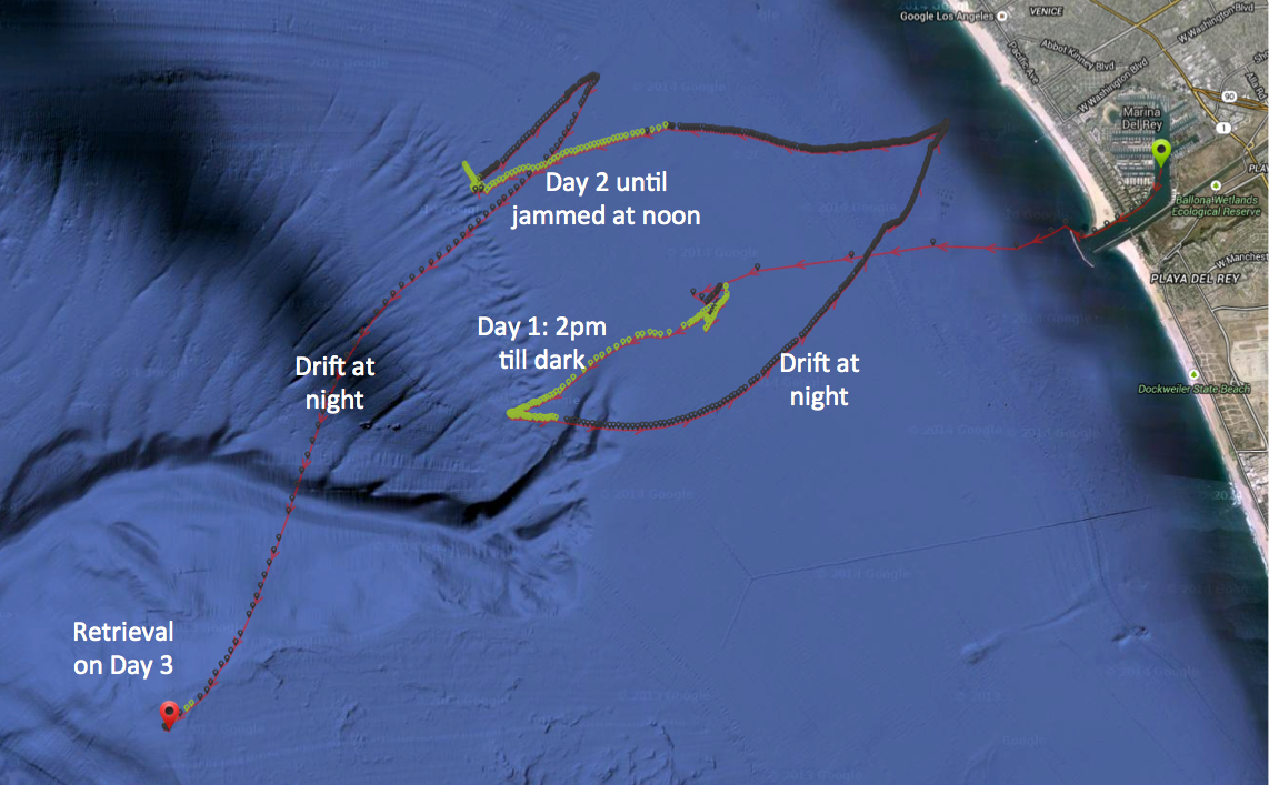 We were attempting to send to the SolarSurfer from Los Angeles to Monterey, CA. The trip, as planned, is approximately 300 miles and would take several weeks to complete. We launched on the 14th but (literally) hit a snag on the second day of the trip. One of the thrusters sucked in a piece of sea grass and jammed. Fortunately it was still close enough that we were able to recover it!