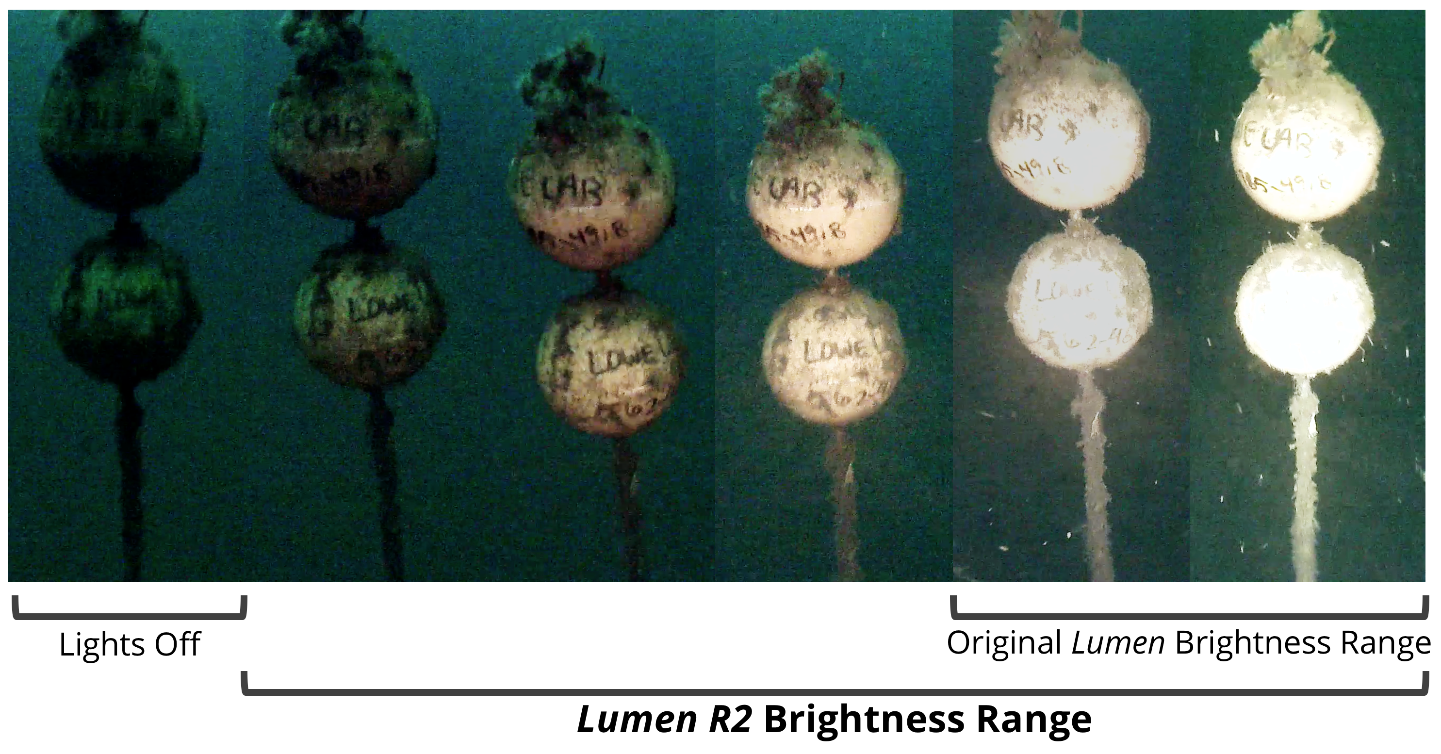 The image below shows a comparison between the old and new brightness ranges in illuminating a mooring at 60m water depth on a cloudy day.